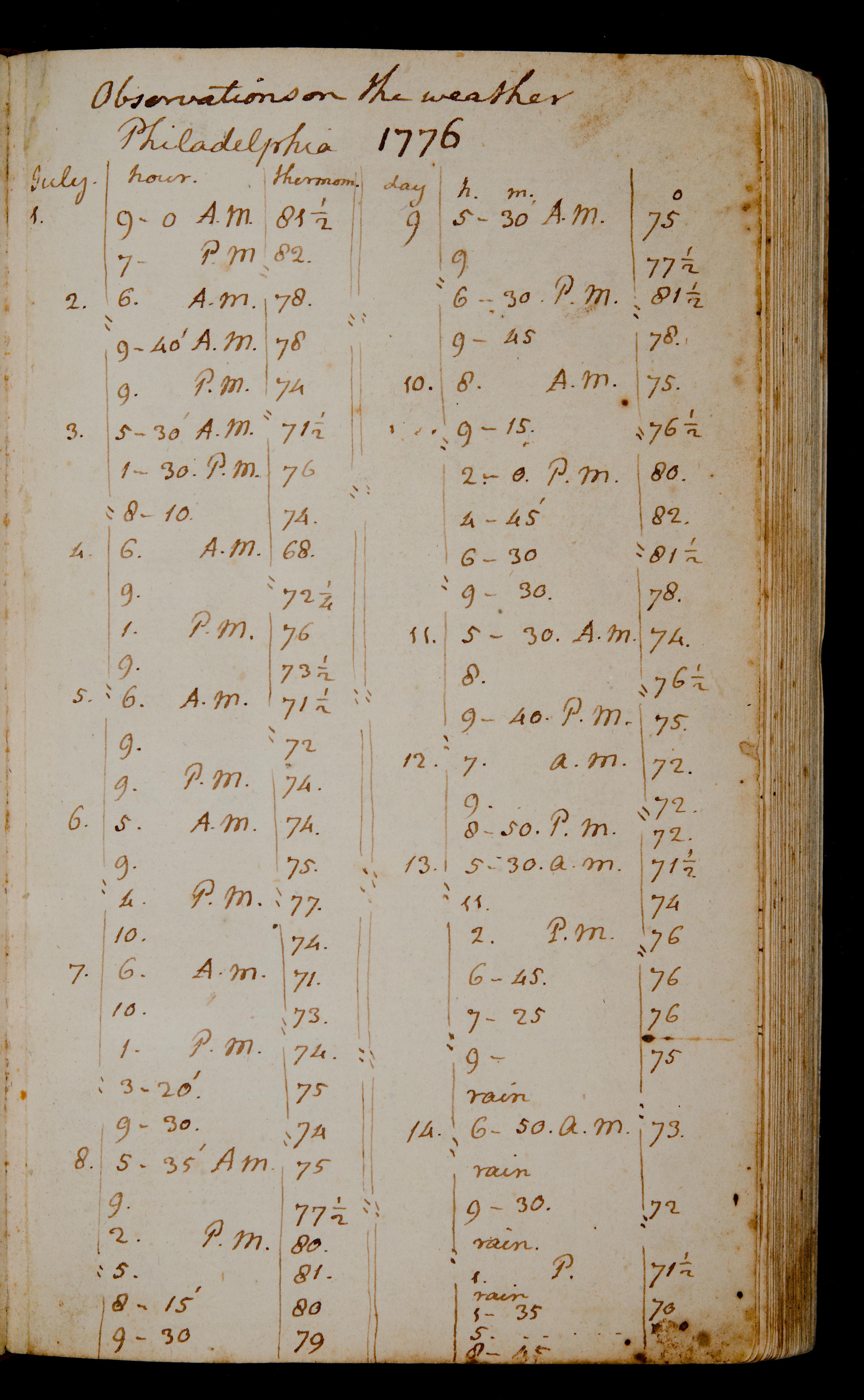 Donate NowFor the more than fifty years that Thomas Jefferson was a systematic weather observer, Monticello was the focus of his efforts to understand the American climate. Well before 1776, the date of his earliest surviving meteorological diary, he was carefully assembling information on the weather of Virginia and making his own observations at Williamsburg and Monticello. The fruits of these endeavors appeared in the chapter on climate in his Notes on the State of Virginia, which, when published in 1785, established his membership in the international fraternity of scientists and natural philosophers.