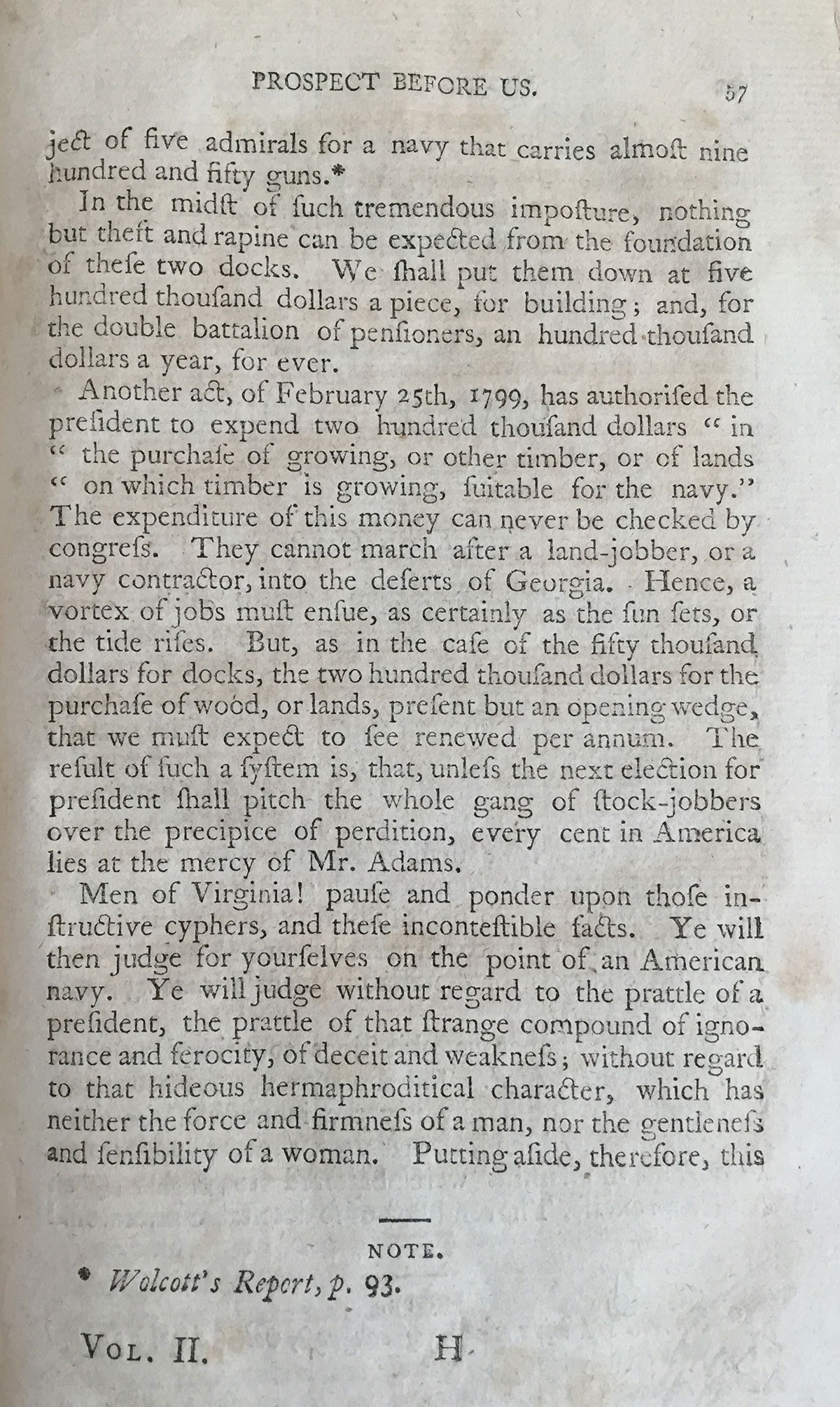 Men of Virginia! pause and ponder upon those instructive cyphers, and these incontestible facts. Ye will then judge for yourselves on the point of an American navy. Ye will judge without regard to the prattle of a president, the prattle of that strange compound of ignorance and ferocity, of deceit and weakness; without regard to that hideous hermaphroditical character, which has neither the force and firmness of a man, nor the gentleness and sensibility of a woman."[1]