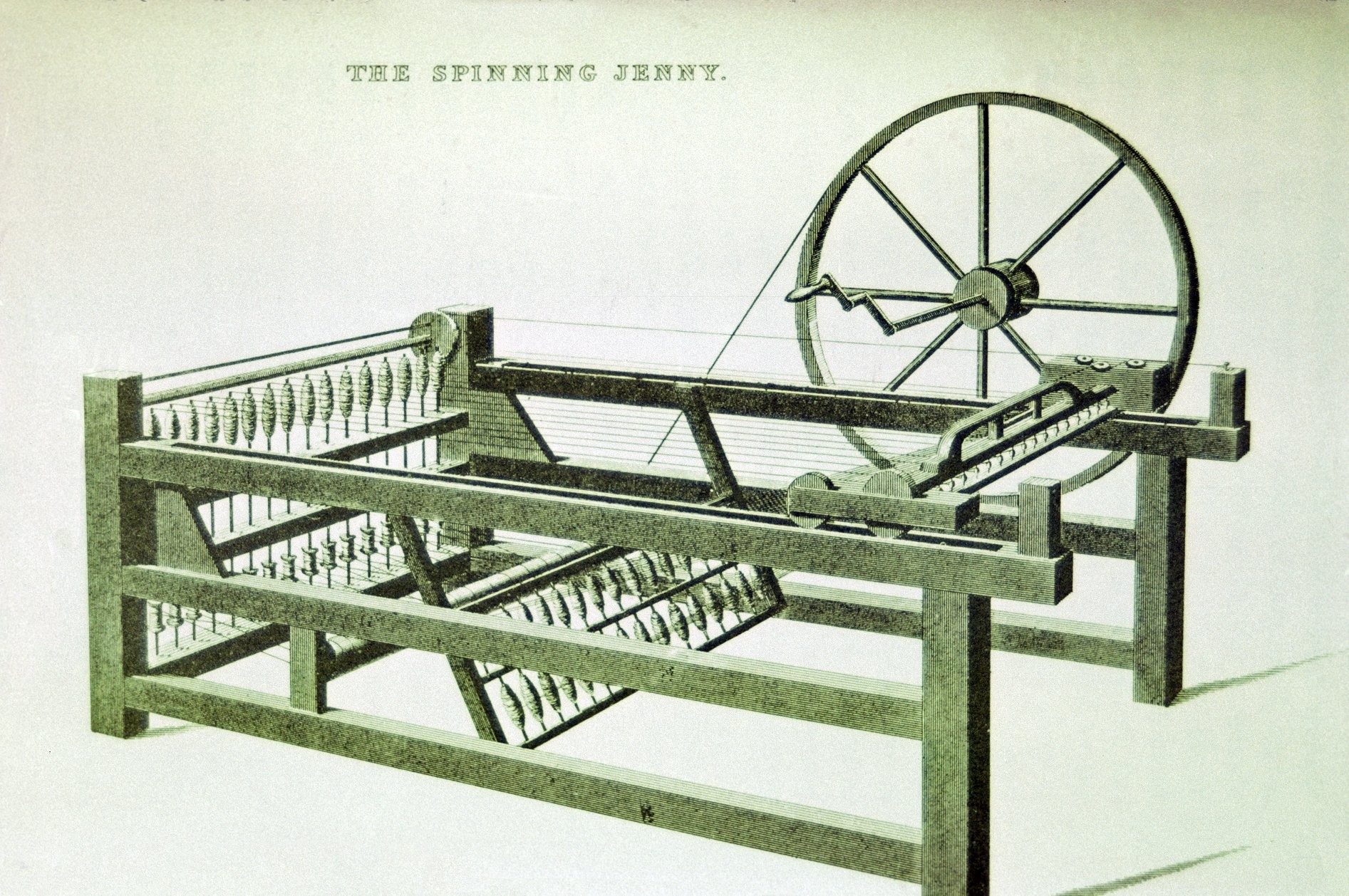 After numerous experiments, Jefferson eventually settled on the spinning jenny patented by James Hargreaves in 1770. He instructed McClure to build jennies of twenty-four spindles each along with two looms fitted with James Kay's 1733 invention, a fly shuttle. A hand-operated machine for carding cotton was soon added, despite the presence of a water-operated woolcarding mill nearby.