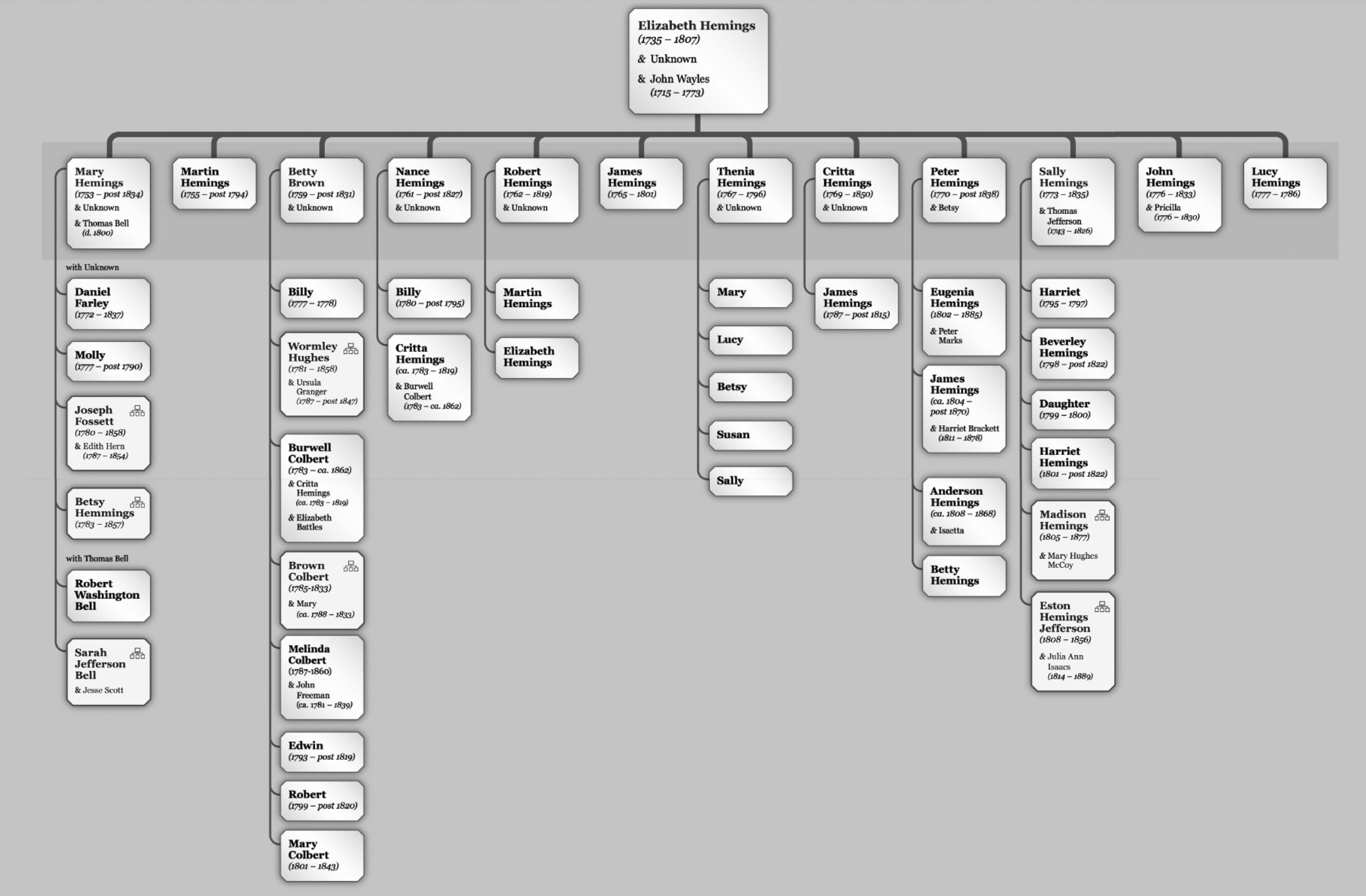 When Beverly and Harriet Hemings passed into white society, they had to deny their family lineage. Historians and family members have been unable to locate their descendants. Both Madison and Eston Hemings acknowledged that they were sons of Thomas Jefferson and passed that knowledge onto their children. Madison and Eston Hemings’s descendants have shared family histories with Monticello’s Getting Word African American Oral History Project.
