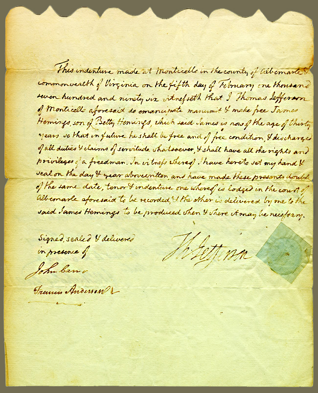 “This indenture made at Monticello in the county of Albemarle and commonwealth of Virginia on the fifth day of February one thousand seven hundred and ninety six witnesseth that I Thomas Jefferson of Monticello aforesaid do emancipate, manumit and make free James Hemings, son of Betty Hemings, which said James is now of the age of thirty years so that in future he shall be free and of free condition, and discharged of all duties and claims of servitude whatsoever, and shall have all the rights and privileges of a freedman. In witness whereof I have hereto set my hand and seal on the day and year abovewritten, and have made these presents double of the same date, tenor and indenture one whereof is lodged in the court of Albemarle aforesaid to be recorded, and the other is delivered by me to the said James Hemings to be produced when and where it may be necessary.”