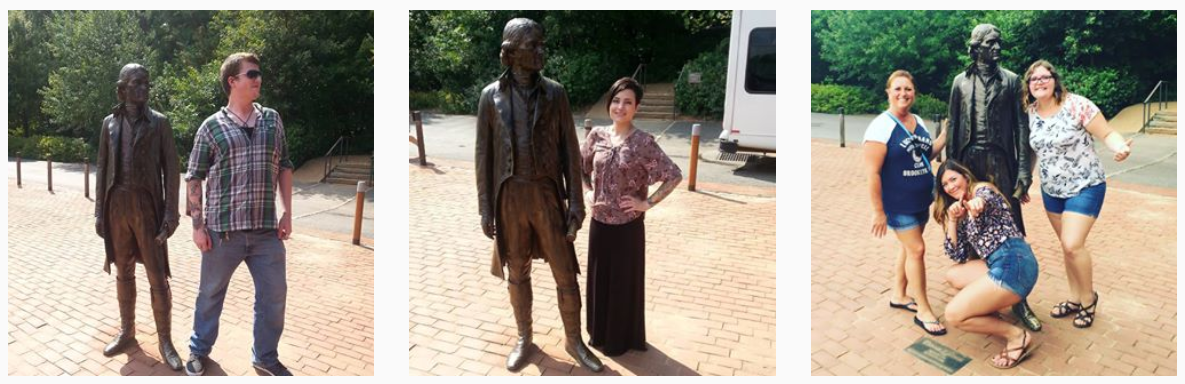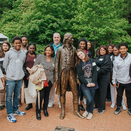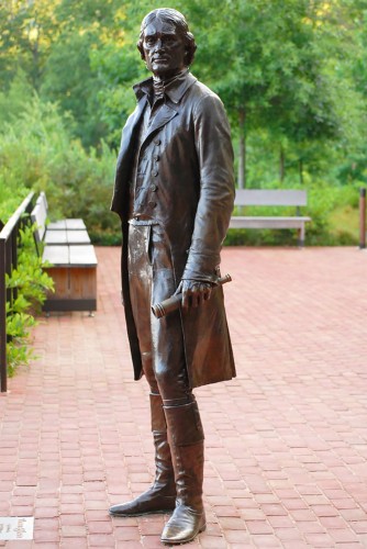 A life-size bronze portrait of Thomas Jefferson enhances the David M. Rubenstein Visitor Center and Smith Education Center.