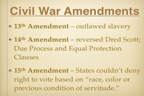 Constitutional Amendments 13-15 ratified, abolishing slavery, defining citizenship, and prohibiting denial of vote based on race