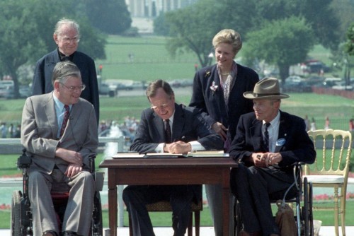 President George H.W. Bush signs the Americans With Disabilities Act prohibiting discrimination against the disabled