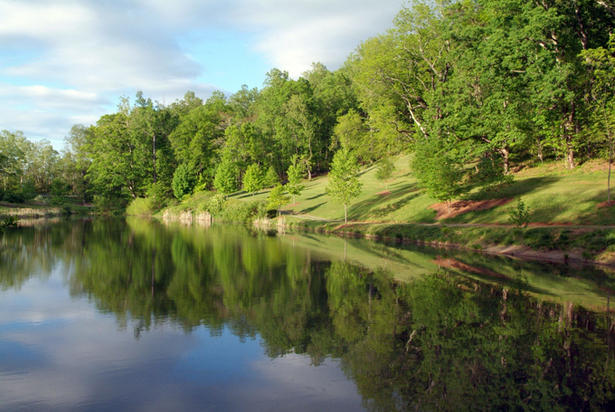 A spur trail circles the pond, which is fed by springs and a seasonal stream from the mountain behind it. The shore has been planted with native species of wetland trees and shrubs. Wetland grasses and reeds have also colonized the water's edge. Several kinds of water-loving birds frequent the site, including blue heron, green heron, Canada goose and duck. The pond has been stocked with indigenous species of fish. It is also the focus of the Fall Color Room in the arboretum, reflecting the bright colors from trees planted on the adjoining slopes.