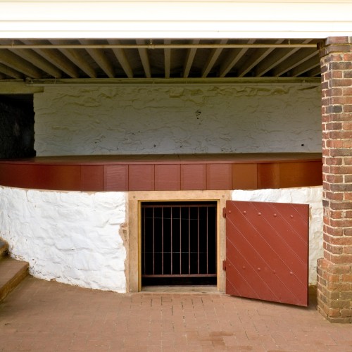 The icehouse, tack room, and bays for horses and carriages were located in the lower level of the North Wing, which connects the passage under the house to the North Pavilion.