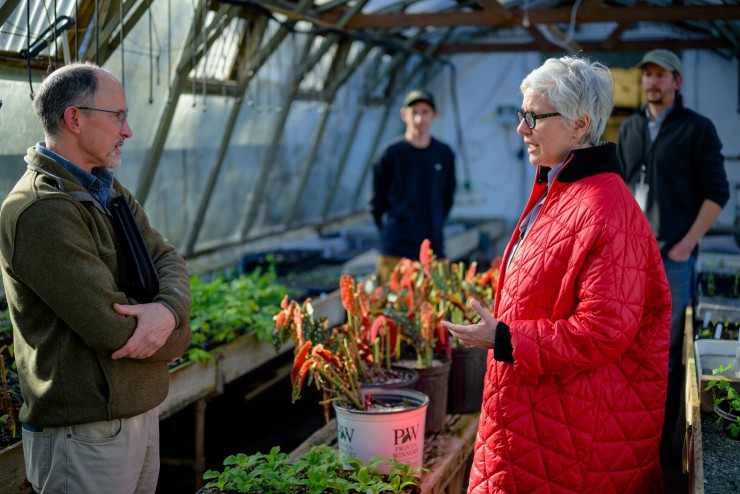Monticello's Gardens and Grounds staff took Kamensky on a tour of one of Monticello's greenhouses, just below the east orchard. This greenhouse acts as a nursery to young seedlings and potted plants that are awaiting planting or relocation in the mountaintop gardens come spring. Kamensky was gifted a beautiful heirloom geranium from the greenhouse. She is seen here in conversation with Roger Gettig (Director of Horticulture) while Michael Tricomi (Manager & Curator of Historic Gardens) and Phillip Sisti (Manager of the Thomas Jefferson Center for Historic Plants).