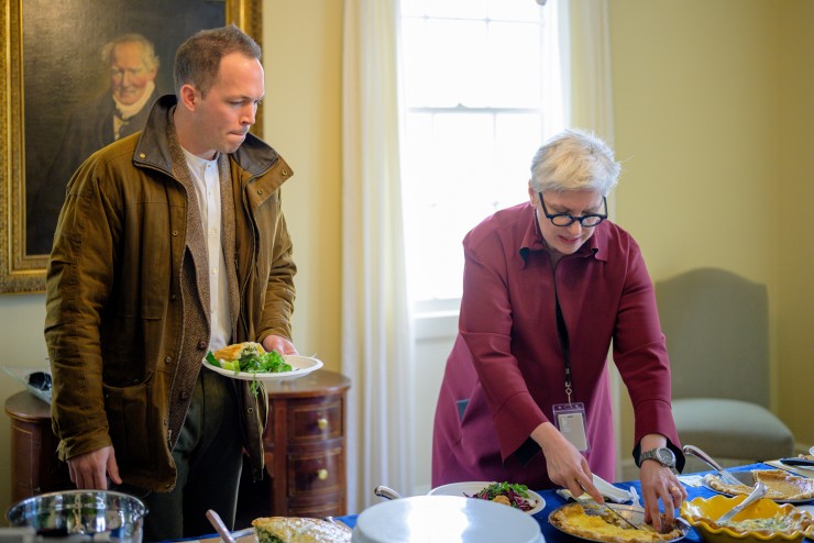 On January 23, Kamensky joined the foundation's research departments at their annual celebration of National Pie Day. Staff from the International Center for Jefferson Studies (ICJS), the Jefferson Library, the Getting Word Oral History Project, Archaeology, the Papers of Thomas Jefferson, and others gathered at the Kenwood campus for a potluck of savory and sweet pies and good conversation. Here Kamensky is seen alongside Andrew Davenport (Director of African American History & the Getting Word Project).