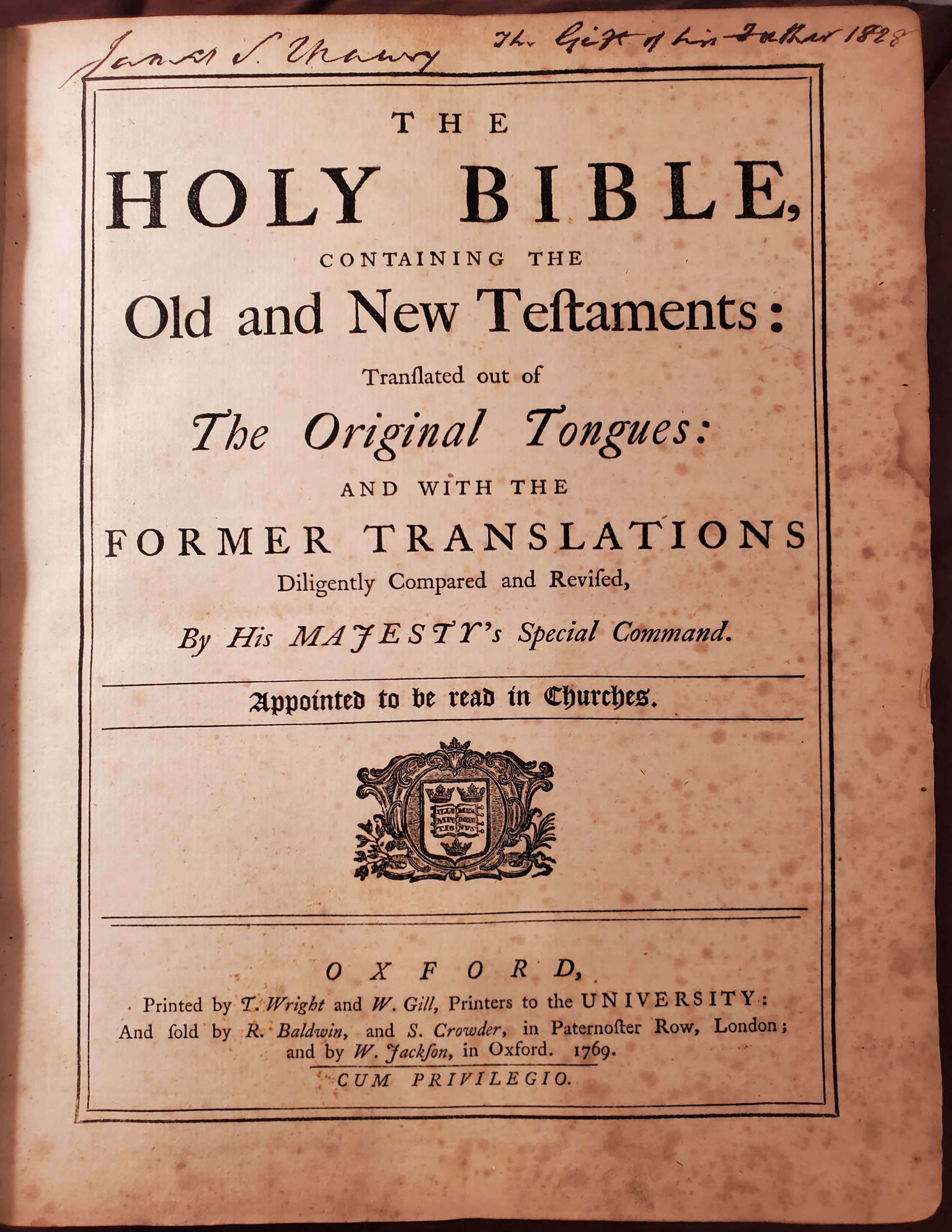 Recently, the Jefferson Library at Monticello received a gift from the Fontaine-Maury Society of a historic family Bible. The Bible was published in 1769 in Oxford, England. It belonged to James Maury (1746-1840), an American merchant who served as the first United States consul in Liverpool, England, from 1790-1812 and 1815-1829. In it, he recorded an extensive family tree, starting with John de la Fontaine all the way through to his own children.