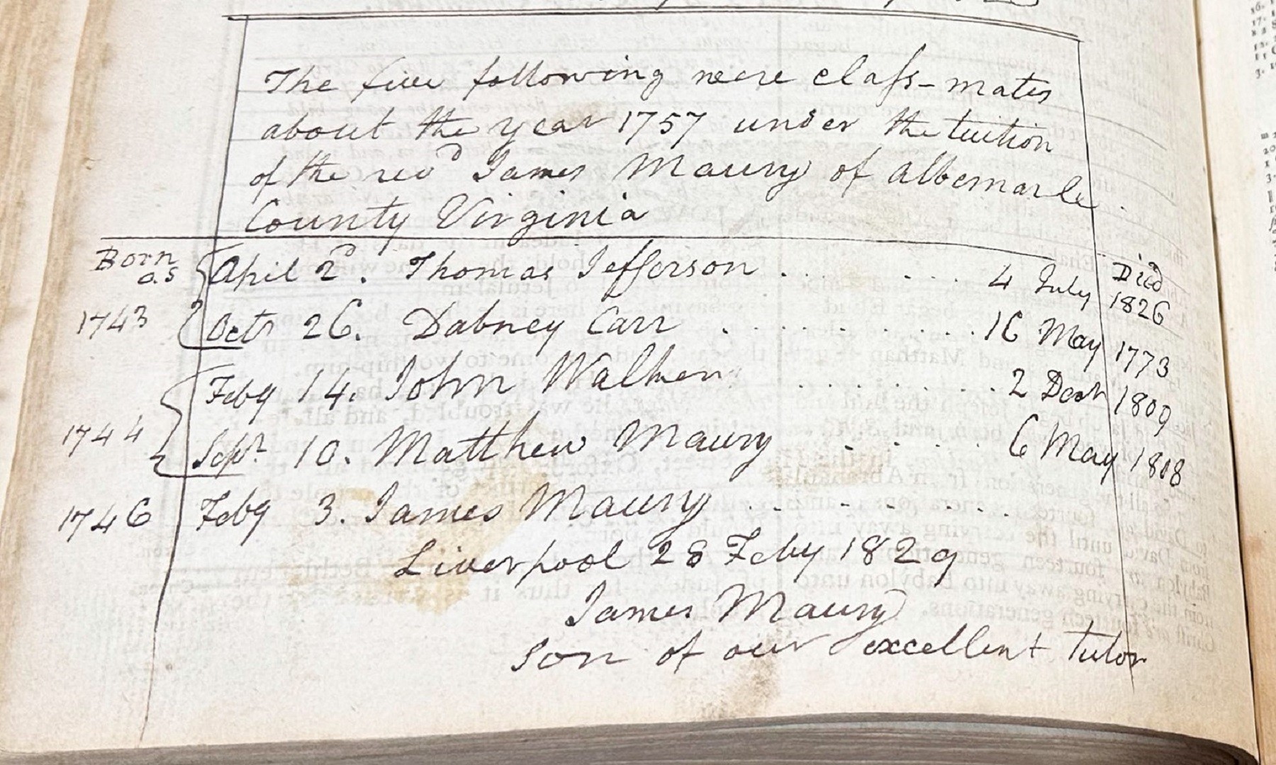 James Maury, the owner of the Bible, was a childhood friend of Thomas Jefferson. Maury’s father, the Rev. James Maury (1718-1769), ran a school which Jefferson attended. On one page of the Bible, consul Maury recorded the name and birthdays of their class of five: Thomas Jefferson, Dabney Carr, John Walker, Matthew Maury (James’ older brother), and James himself.