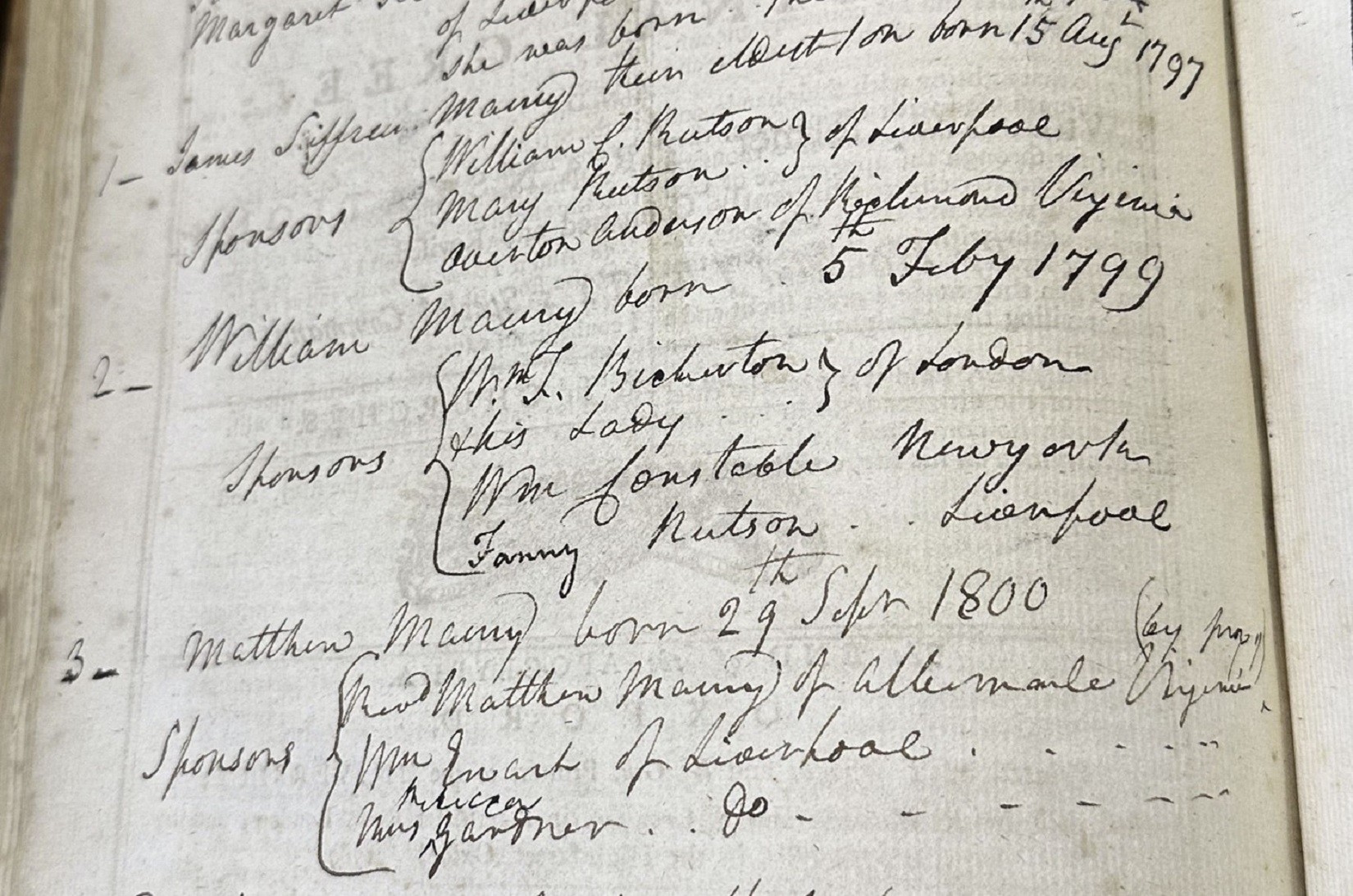 His first wife, Catherine Armistead Maury, died in 1794. Respecting her wishes, her body was returned to Virginia and buried near her father in the grounds of St. George’s Church, Fredericksburg. In 1796, James married Margaret Rutson, an Englishwoman. They had five children: James Sifrein, William, Matthew, Ann, and Rutson. James recorded all of their births in the Bible, along with the dates of their baptisms and the names of their godparents.