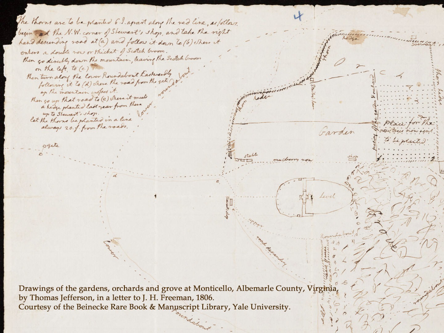 Jefferson's 1806 sketch, with the Grove in the lower right corner. Drawing is oriented with north at the bottom.In an 1806 sketch of Monticello mountain, Thomas Jefferson recorded 18 acres on the northwestern side as the “Grove.” He intended the Grove to be an ornamental forest with the undergrowth removed, the trees pruned and thinned, and the woodland “broken by clumps of thicket, as the open grounds of the English are broken by clumps of trees.”