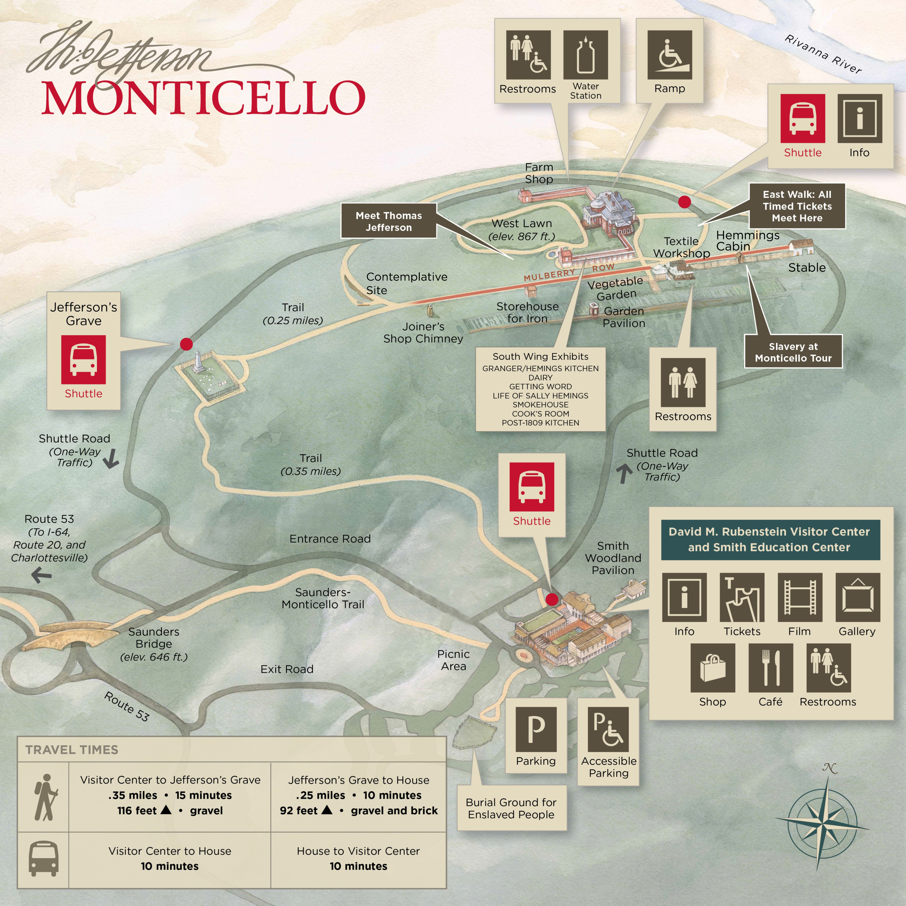 A visit starts at the David M. Rubenstein Visitor Center where you'll find exhibits on Jefferson and Monticello, an introductory film, a hands-on discovery room, food, shopping, and free parking for cars, buses and RVs.