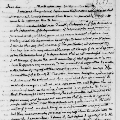 In an 1823 letter to James Madison, Jefferson contradicts both John Adams’s and Timothy Pickering’s versions of how the Declaration of Independence came to be.