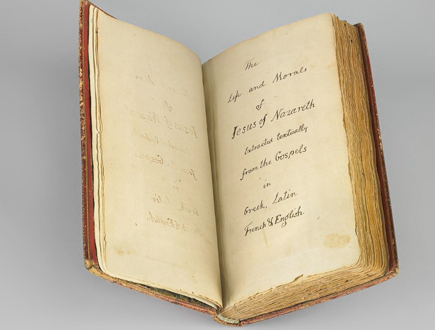 Donate NowThe Life and Morals of Jesus of Nazareth, known today as The Jefferson Bible, is Thomas Jefferson's own compilation of the four gospels in the New Testament. Jefferson cut out excerpts from six New Testament volumes in English, French, Latin, and Greek, and then assembled them together in this single volume. He arranged his chosen passages to create a chronological account of Jesus' life, parables, and moral teachings. He omitted passages that he deemed insupportable through reason or that he believed were later embellishments, including references to Jesus' miracles and his resurrection. In doing so, Jefferson sought to clarify Jesus' moral teachings, which he believed provided "the most sublime and benevolent code of morals which has ever been offered to man."[1]