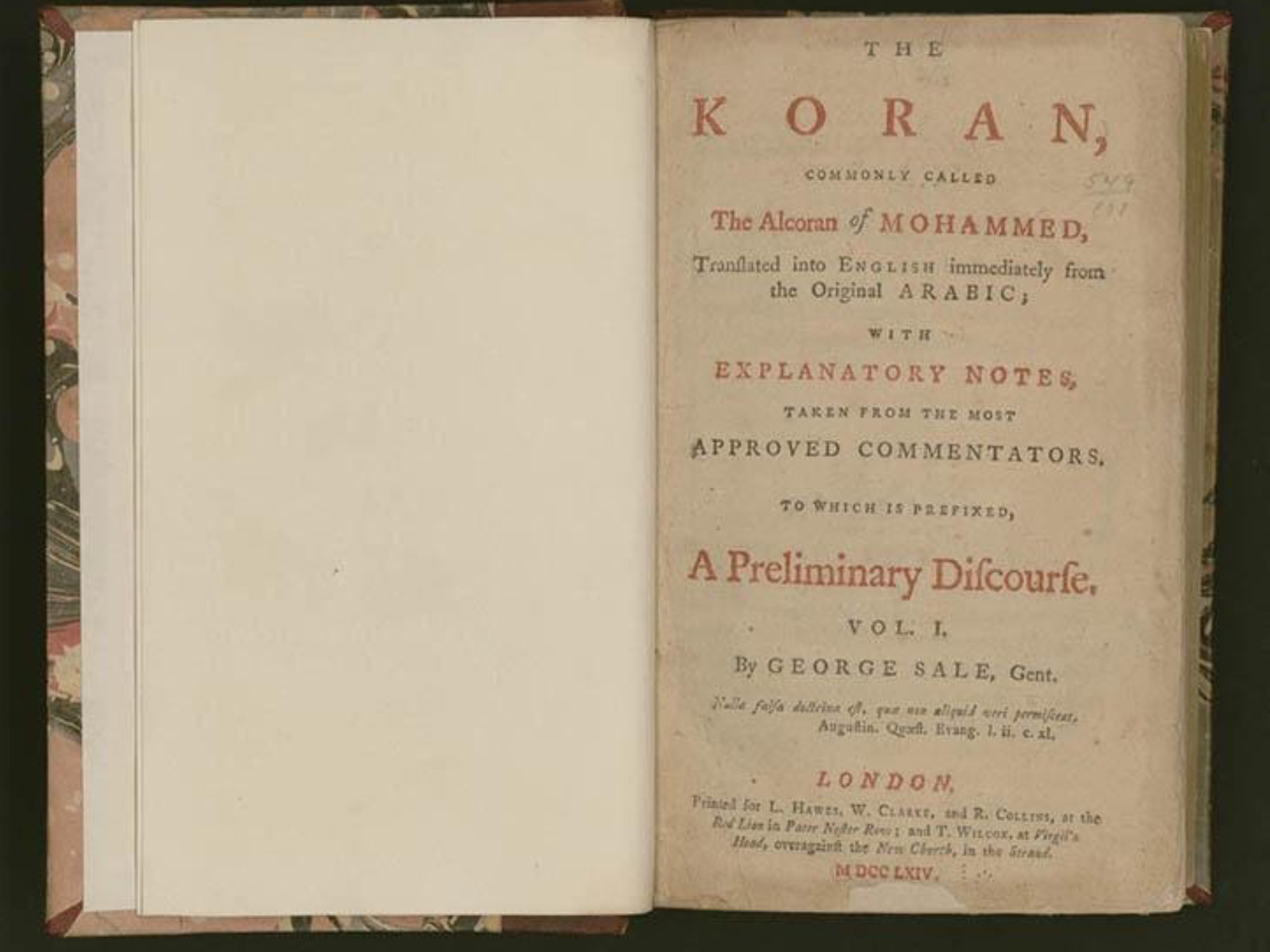 Thomas Jefferson owned a copy of the Qur'an, which was the second edition of a 1734 translation by George Sale, a two-volume set published in London in 1764. This set was sold to the Library of Congress in 1815, and rebound by the Library in 1918. The daybook of the Virginia Gazette records the purchase of this edition by Jefferson in Williamsburg in 1765.[1] There are no other known records of Jefferson reacquiring this work, suggesting perhaps that it survived the fire at Jefferson's family home, Shadwell, in 1770.