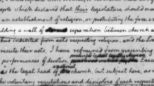 "I contemplate with sovereign reverence that act of the whole American people which declared that their legislature should ‘make no law respecting an establishment of religion, or prohibiting the free exercise thereof,’ thus building a wall of separation between Church & State."