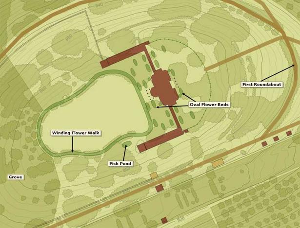 The winding walk defines the perimeter of the leveled, oval-shaped West Lawn. The "smooth, level" lawn was a favorite playground for the children, although the earliest images of the West Front of Monticello reveal a weedy, disheveled surface. The lawn was probably scythed once or twice a year and its appearance inevitably reflected the pre-lawn mower technology of the early nineteenth century.