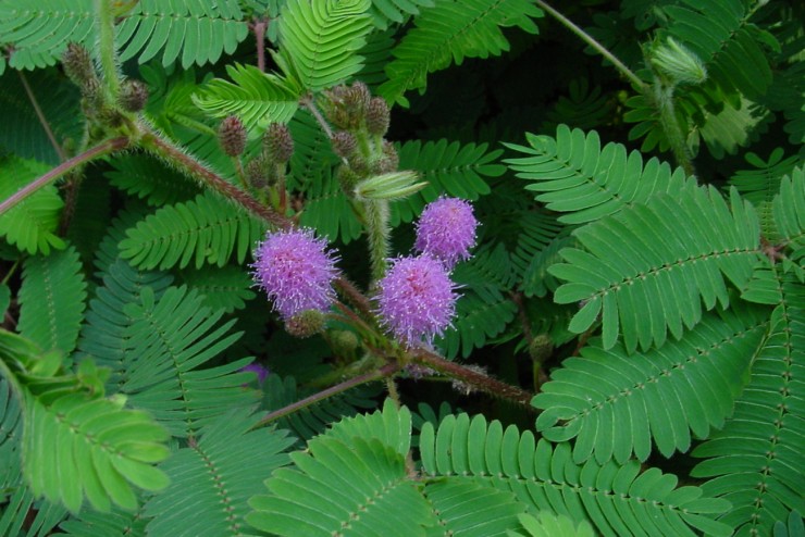 Sensitive Plant (Mimosa pudica) blooms in late July or early August, but it's always fun to watch its leaves fold together when touched.