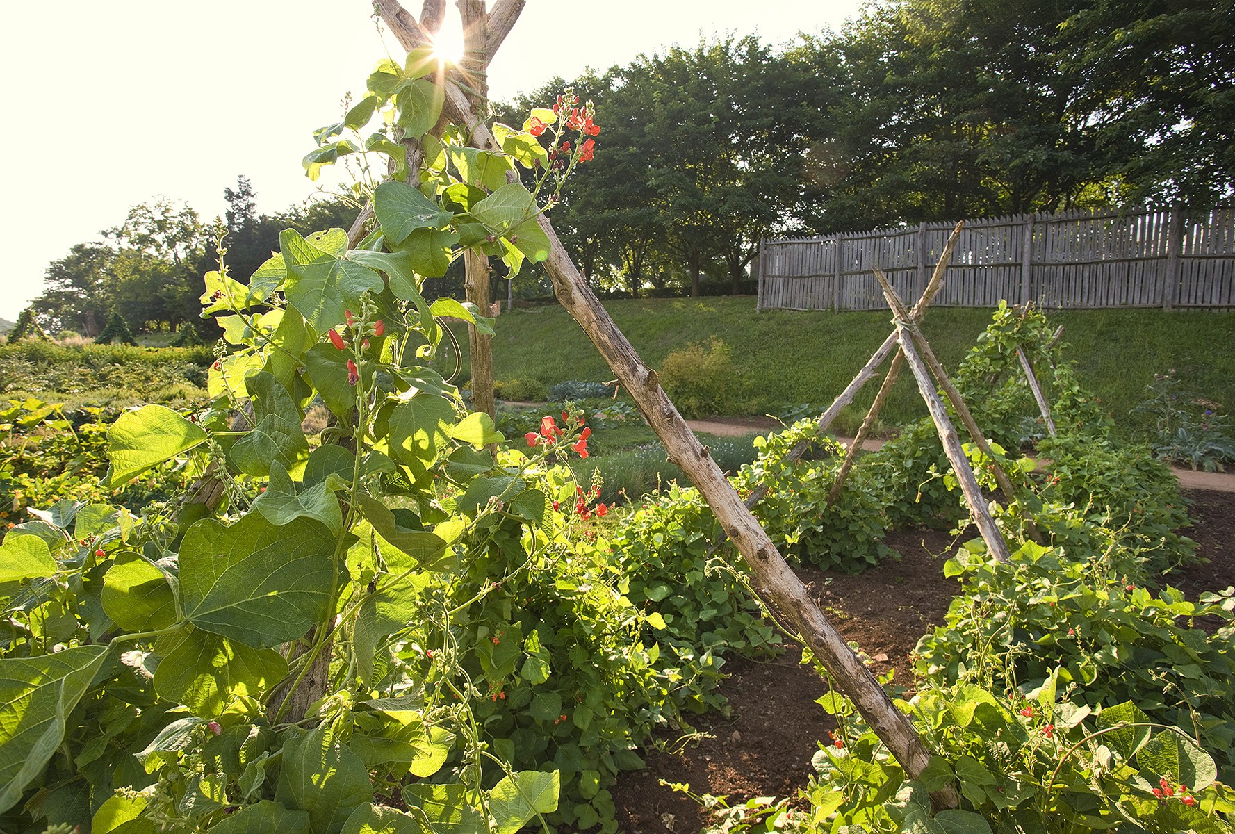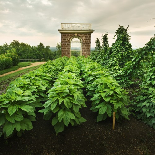 The garden was essentially a functional part of the plantation, with enslaved workers cultivating vegetables and fruits year-round to provide produce for the main house. Yet Jefferson occasionally incorporated ornamental features aside from the Garden Pavilion. He discussed planting an arbor of different flowering shades of the scarlet runner bean (shown at right), arranged adjacent rows of purple, white, and green sprouting broccoli, or even white and purple eggplant, and he bordered his tomato square with sesame or okra, a rather unusual juxtaposition of plant textures. Cherry trees were also planted along the "long, grass walk" of the garden to provide shade.