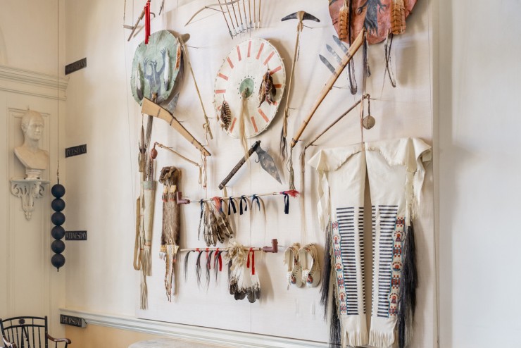 Indian artifacts numbered at least forty, including pipes, clothing, domestic objects, and a Mandan buffalo robe depicting a battle scene.