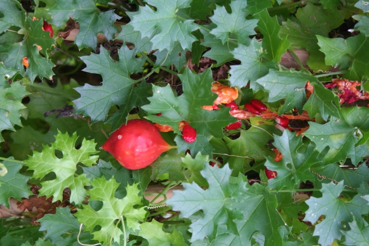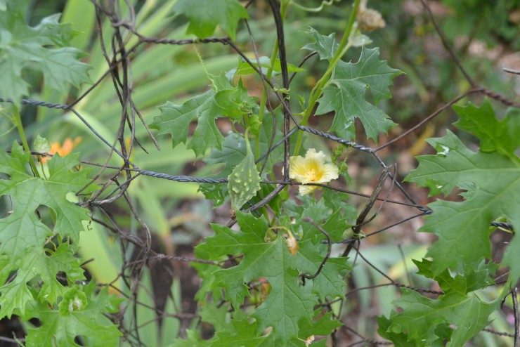 Although the pale yellow, deeply-veined flowers have a subtle beauty, its round, somewhat warty, bright-orange fruits, or "apples", are its most distinguishing feature. When ripe, the fruits burst apart, revealing numerous seeds covered with a brilliant scarlet, extremely sticky coating. The Balsam Apple was introduced into Europe by 1568 and was used medicinally to treat wounds.[3]