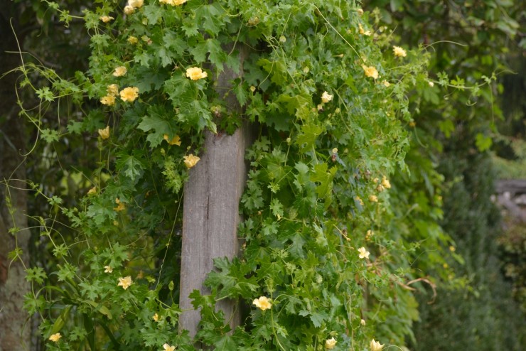 In 1810, Thomas Jefferson noted the sowing of this annual vine in Monticello's flower borders along with Larkspur, Poppies, and Nutmeg Plant.[1] Bernard McMahon listed this species as "tender annual flowers" in The American Gardener's Calendar, an important reference manual that Jefferson owned and often consulted.[2] The Balsam Apple is a tropical vine grown as a garden annual with bright yellow flowers followed by curious, oblong, yellow-orange warty fruits that burst open when ripe, and has attractive, glossy green foliage. It is native to the tropical regions of Africa, Asia, and Australia.