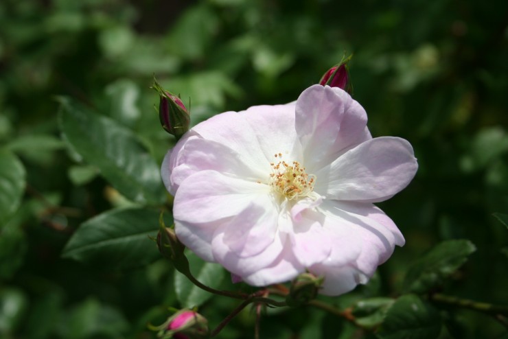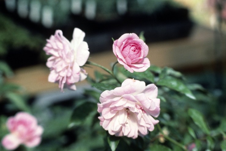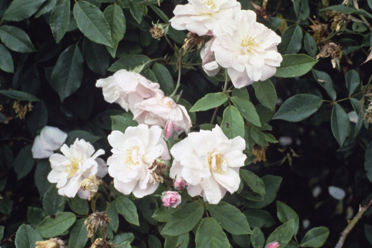 The original Noisette selected by John Champneys in Charleston, SC, with clusters of fragrant, double, pale pink blossoms and glossy green, pointed leaves. it was the first hybrid between the China and the Musk roses and is sometimes listed as Rosa chinensis x moschata. See the 1999 Twinleaf article, Champneys Pink Cluster Comes to Monticello, for more information on this rose.