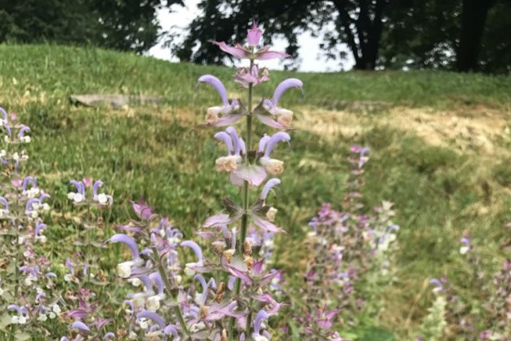 Clary Sage is a biennial herb native to the Mediterranean and the Orient. It has been cultivated in Britain for over four centuries and in American gardens for almost as long. The broad and handsome leaves, which literally sparkle in the light, were a source of an aromatic oil used in medicine, for flavoring soups and omelets, and as a substitute for common Sage. A traditional common name, "cleere eie" or "clear eye" referred to a belief in its vision-healing properties. Clary produces three to four foot flower stalk with pale-blue blossoms in loose, terminal spikes. Prefers a sunny site.