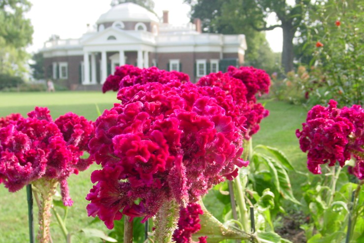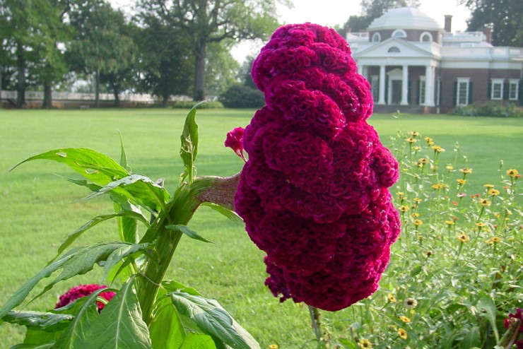 Thomas Jefferson noted the planting of seeds of "Cockscomb, a flower like the Prince's feather" in 1767. This is likely the crested form of Celosia with its strange scarlet combs that are furrowed and lobed. In 1811, Jefferson wrote Bernard McMahon: "I have an extensive flower border, in which I am fond of placing handsome plants or fragrant. Those of mere curiosity I do not aim at." Still, the shockingly curious flowers of the Cockscomb must have delighted visitors to Monticello in Jefferson's time, just as they continue to do today.
