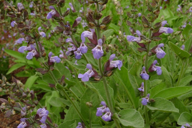 Sage was a standard in kitchen gardens from colonial times, and Jefferson listed it in 1794. This culinary Mediterranean shrub, grown since the thirteenth century, was thought to prolong life. Its soft, gray-green foliage and spikes of lavender flowers make it an attractive ornamental.