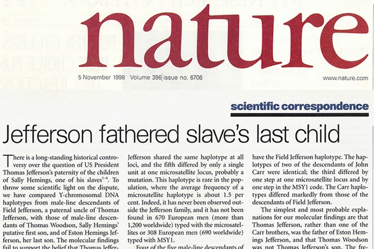 The November 5, 1998 issue of Nature included the findings of the DNA on male-line Jefferson and Hemings desecendants.