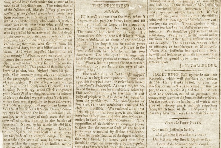 In September 1802, political journalist James T. Callender, a disaffected former ally of Jefferson, wrote in a Richmond newspaper that Jefferson had for many years "kept, as his concubine, one of his own slaves." "Her name is Sally," Callender continued, adding that Jefferson had "several children" by her.