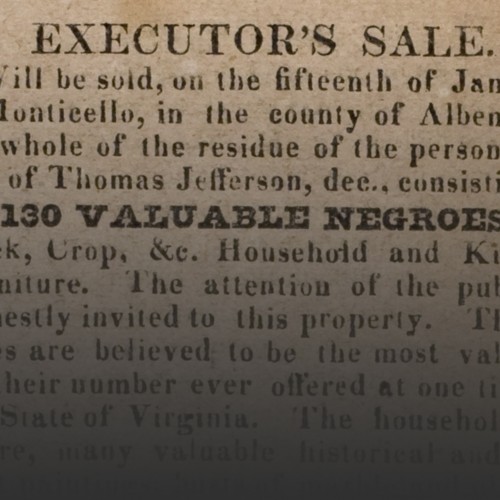 Following Jefferson's death in 1826, 130 enslaved individuals were offered for sale at Monticello to help settle his enormous debts.