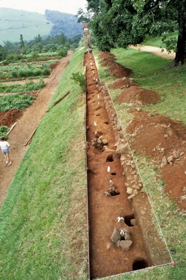 Mulberry Row, named for the mulberry trees planted alongside it, was the center of plantation activity at Monticello from the 1770s until Thomas Jefferson's death in 1826. Jefferson's original plan for the site was a 400-foot-long row of shops and yards joined structurally so as to look like a single building.[1] There, ironworking and woodworking facilities and areas for raising poultry and slaughtering livestock would serve as a link between the plantation at large and the domestic operations, like kitchen, dairy, and smokehouse, that Jefferson planned for the dependency wings attached to the main house.[2]