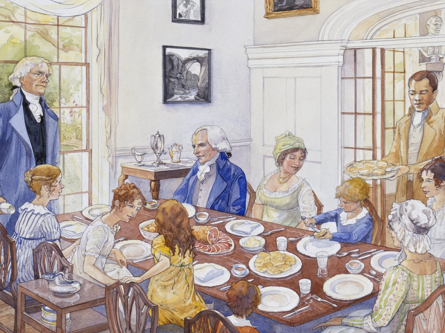Following breakfast, kitchenware, dinnerware and utensils would be washed and dried and the work of preparing dinner would begin. Dinner was served promptly at 3:30 in the afternoon requiring advance planning to make the best use of the roasting spits and eight stew burners. The three to four hours period prior to dinner were a time to slaughter and hang fowl, beef, and lamb, scale fish and ensure sufficient vegetables were on hand. In the fall, curing and smoking ham required constant attention over a three-week period. Soups, entrees, sauces and vegetable side dishes would be prepared by Edith Fossett and Frances Hern with Peter Hemings making desserts and children such as Israel Gillette and Betsy-Ann Fossett on hand to peel and cut vegetables, stir sauces, slice cheese and help transfer food from the main kitchen to the warming kitchen beneath the dining room. In the dining room, Burwell Colbert and his team of enslaved children, including Eston Hemings, set the tables for provided service à la française, a formal version of family style, with diners serving themselves.