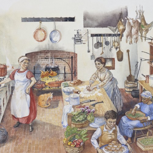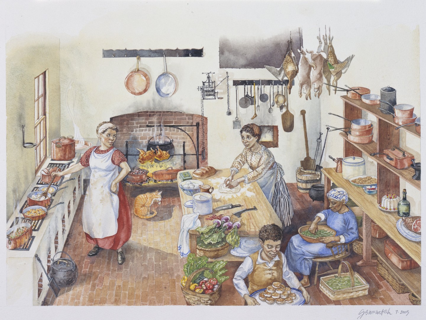 Preparing breakfast, dinner and evening snacks to Jefferson’s standards required long hours and attention to detail. Up to twenty people, including Jefferson, his extended family and steady stream of guests dined each day with a representative dinner consisting of “Rice soup, round of beef, turkey, mutton, ham, loin of veal, cutlets of mutton or veal, fried eggs, fried beef, a pie called macaroni, vegetables in season and ice cream for dessert accompanied by pudding, a great variety of fruit, plenty of wines."