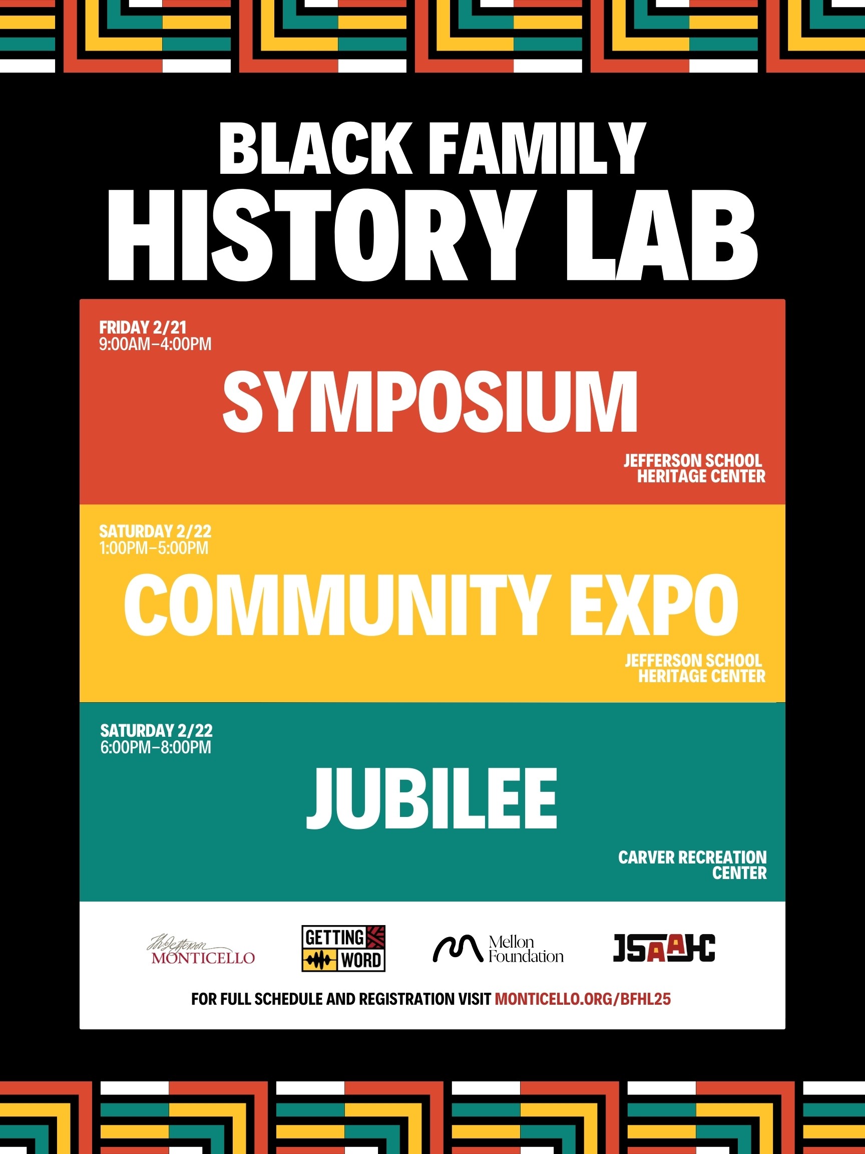 On Friday, February 21, join us for our Black Family History Lab Symposium at the Jefferson School African American Heritage Center. The symposium will explore the interwoven ties that bind together local and familial African American histories in Central Virginia and beyond. Engage in enriching panels, interactive workshops, and connect with others to foster a deeper sense of community, connection, and care.