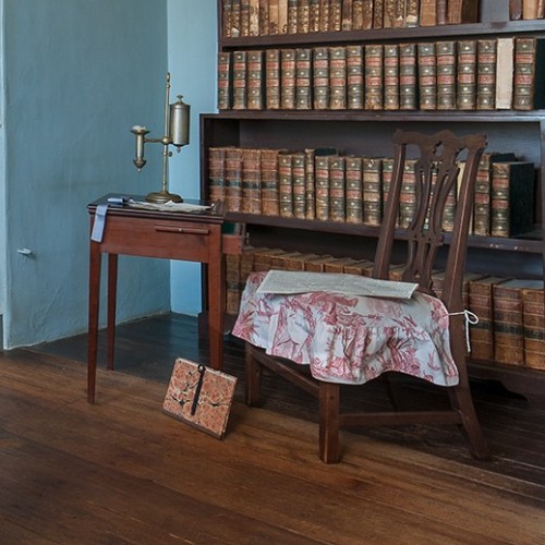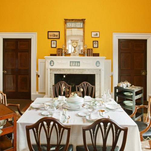 Like many Americans in the early nineteenth century, Thomas Jefferson and his family ate only two meals a day at Monticello: breakfast, typically at eight, and dinner, in the late afternoon. Both meals were served in the Dining Room, and, if extra space were needed, in the adjoining Tea Room. Before every meal, two bells rang to alert family and guests, one to call them to the table, and one when the meal was served.