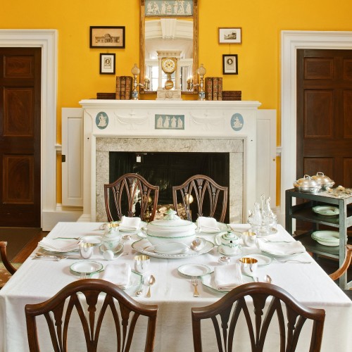 Guests to Monticello noted that the first dinner bell customarily rang at three o'clock, and the second called them to the table at four. When they arrived in the Dining Room, they quite likely found Thomas Jefferson reading. Having a self-described "canine appetite for reading" and hating to waste even a moment waiting for others to gather, he kept books on the fireplace mantel.