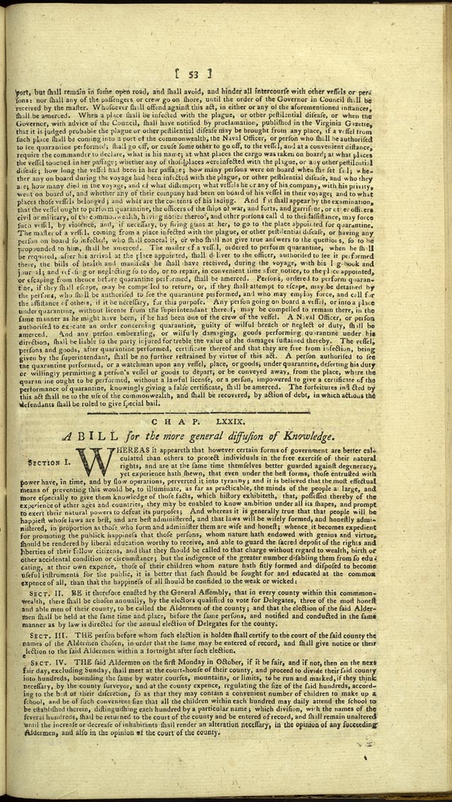 Whereas it appeareth that however certain forms of government are better calculated than others to protect individuals in the free exercise of their natural rights, and are at the same time themselves better guarded against degeneracy, yet experience hath shewn, that even under the best forms, those entrusted with power have, in time, and by slow operations, perverted it into tyranny; and it is believed that the most effectual means of preventing this would be, to illuminate, as far as practicable, the minds of the people at large, and more especially to give them knowledge of those facts, which history exhibiteth, that, possessed thereby of the experience of other ages and countries, they may be enabled to know ambition under all its shapes, and prompt to exert their natural powers to defeat its purposes; And whereas it is generally true that that people will be happiest whose laws are best, and are best administered, and that laws will be wisely formed, and honestly administered, in proportion as those who form and administer them are wise and honest; whence it becomes expedient for promoting the publick happiness that those persons, whom nature hath endowed with genius and virtue, should be rendered by liberal education worthy to receive, and able to guard the sacred deposit of the rights and liberties of their fellow citizens, and that they should be called to that charge without regard to wealth, birth or other accidental condition or circumstance; but the indigence of the greater number disabling them from so educating, at their own expence, those of their children whom nature hath fitly formed and disposed to become useful instruments for the public, it is better that such should be sought for and educated at the common expence of all, than that the happiness of all should be confided to the weak or wicked: ....[1]