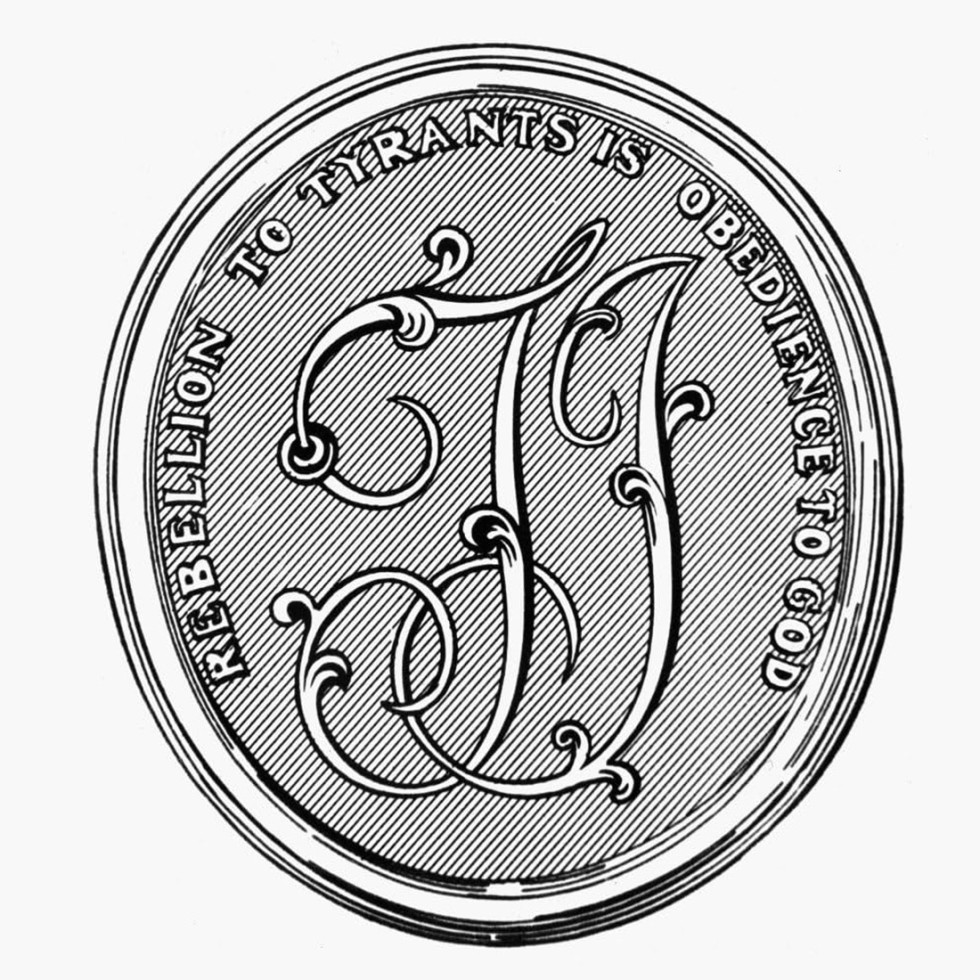 "Rebellion to tyrants is obedience to God" was a motto suggested, but not used, for the Seal of the United States. Jefferson eventually appropriated it for his own seal. The source of the motto as used by Jefferson is likely Benjamin Franklin.[4]