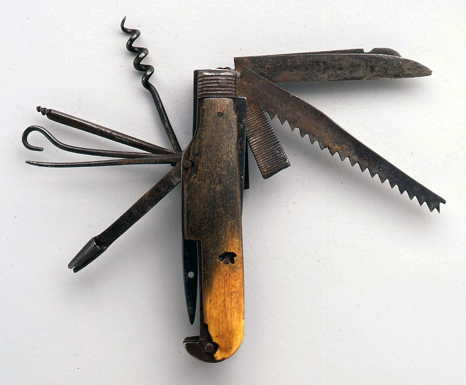 Historical Notes: Jefferson recorded purchases of several knives in his memorandum books between 1767 and 1819, but it is not clear when this particular pocketknife with wooden sides and multiple blades was acquired. The handy device has twelve tools, including saw, file, drill, corkscrew, and knife blades. It is very similar to pocketknives illustrated in a pattern book of the predominant Sheffield cutlery manufacturers in 1816.[1]