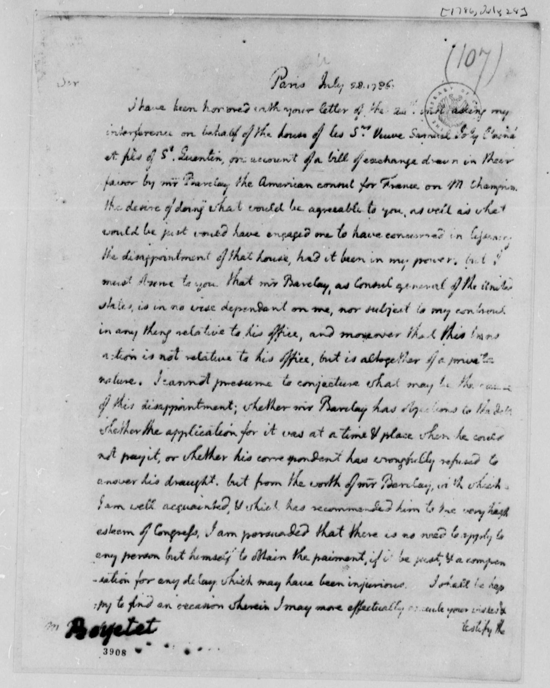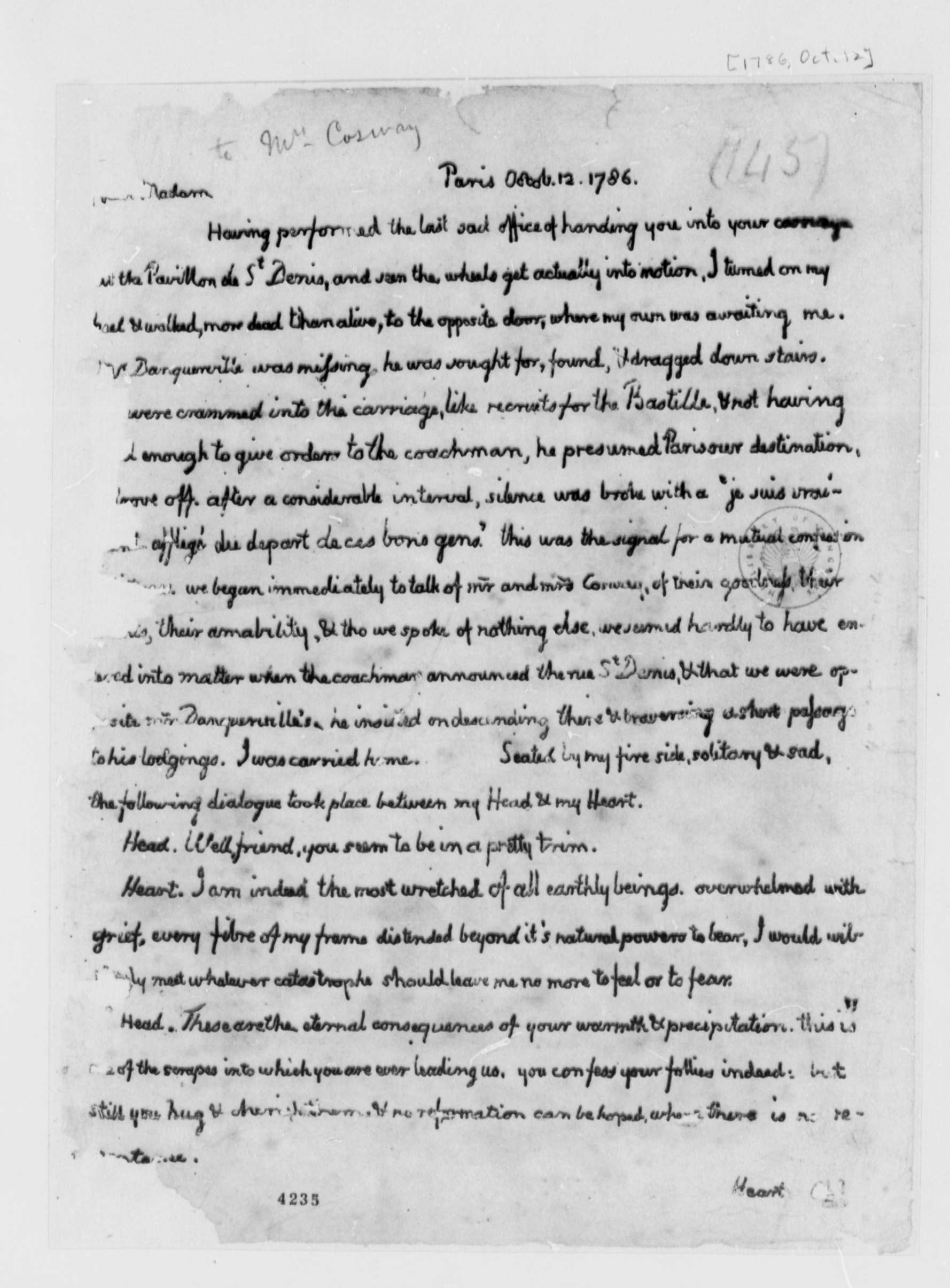 Donate NowThomas Jefferson was right-handed. However, in the fall of 1786, after breaking his right wrist in Paris, Jefferson temporarily used his left hand for writing letters. One of his most famous letters — sometimes referred to as the "Head and Heart" letter — was written entirely with his left hand.[1]