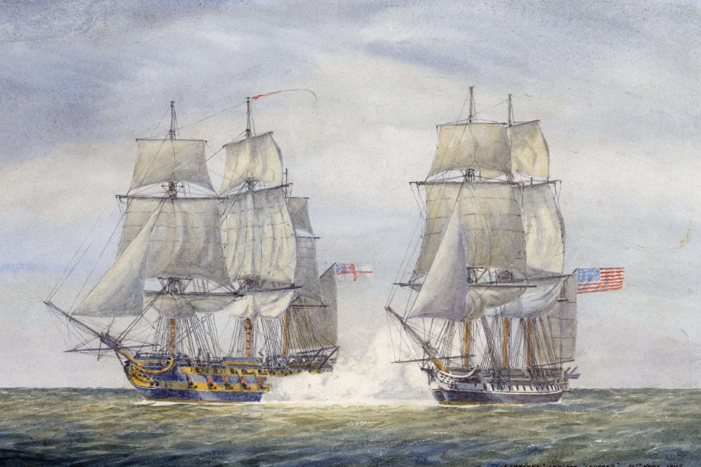 On board the Chesapeake, Captain James Barron was preparing to sail to the Mediterranean. On June 22, 1807, the Chesapeake and the H.M.S. Leopard crossed paths. The Chesapeake halted alongside the Leopard in order to allow the British messenger on board. The messenger recited the proclamation given to him by his superiors. Captain Barron refused to allow the British to search his ship. The captain made it clear that there were no such men aboard the ship. Shortly after, the Leopard fired upon the Chesapeake in retaliation. Approximately twenty minutes later, the American ship surrendered to the British demands. On board the Chesapeake, the British looked at the muster and took the three men in question off the ship, as well as John Wilson (also known as Jenkin Ratford), who was a proven deserter. In addition to the four men taken off the ship, three seamen were killed, eight were seriously injured, and ten more sustained non-life-threatening injuries.