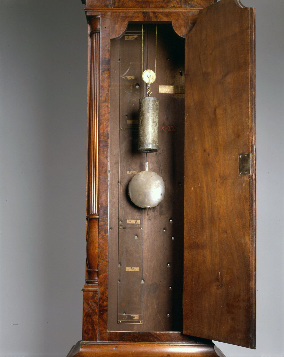 Situated in his private suite, the clock has no striking mechanism and operates with a single weight with day marking labels affixed in Jefferson's handwriting on the inside of the clock case corresponding to the position of the descending weight.