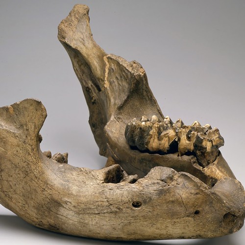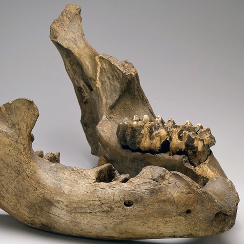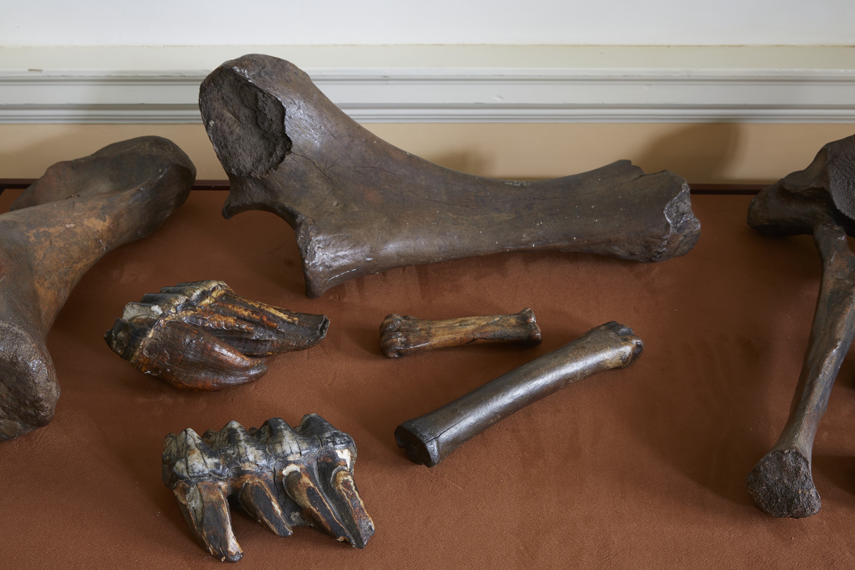 The remainder of Jefferson's collection was divided between the Society and Monticello, where the fossils were displayed in the Entrance Hall. "There is a tusk and a femur which Genl. Clark procured particularly at my request for a special kind of Cabinet I have at Monticello," Jefferson wrote to Wistar.[7] Visitors to Monticello recorded seeing upper and lower jawbones, tusks, thigh bones, a head, and teeth of the "mammoth" in particular, as well as bones from other animals as well as petrifications.[8]